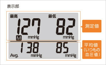 (測定直後に比較できます)平均値と今回の測定値を同時に表示するので、血圧計本体だけでも変化をみることが可能。